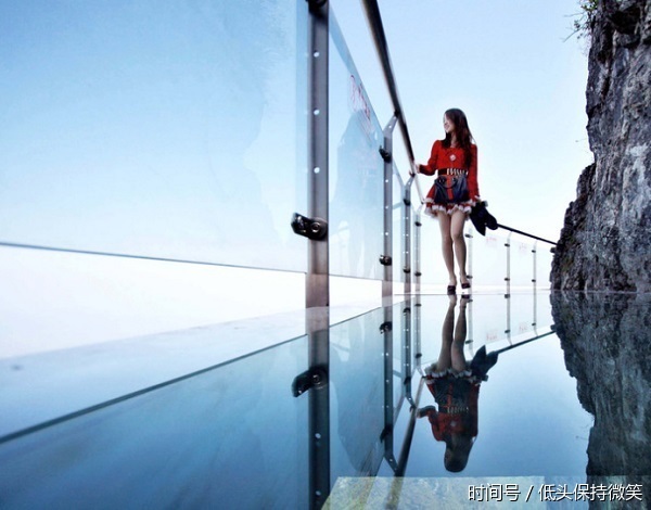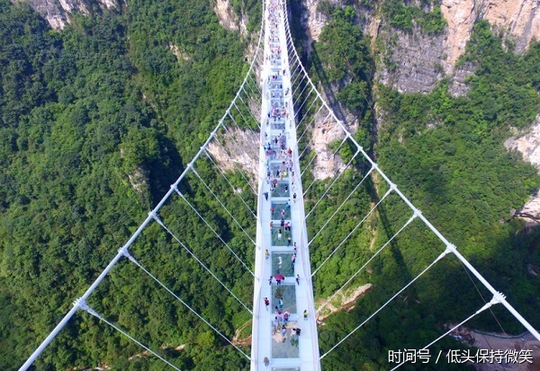 张家界大峡谷玻璃桥位于湖南省的张家界大峡谷景区内,号称世界最长、最高的全透明玻璃桥,玻璃桥总长430米、宽6米,桥面距谷底约300米,可站800人。桥面全部采用透明玻璃铺设,桥中心有全球最高的蹦极台,整个工程无钢筋支架,是一种全玻璃结构的桥梁。