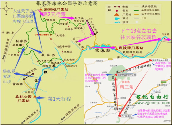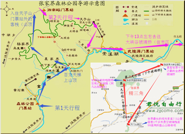 走法1、天子山门票站进---游览天子山景区----然后到杨家界景区游览----接着到袁家界景区游览---百龙下山---武陵源门票站出----入住武陵源区的酒店。