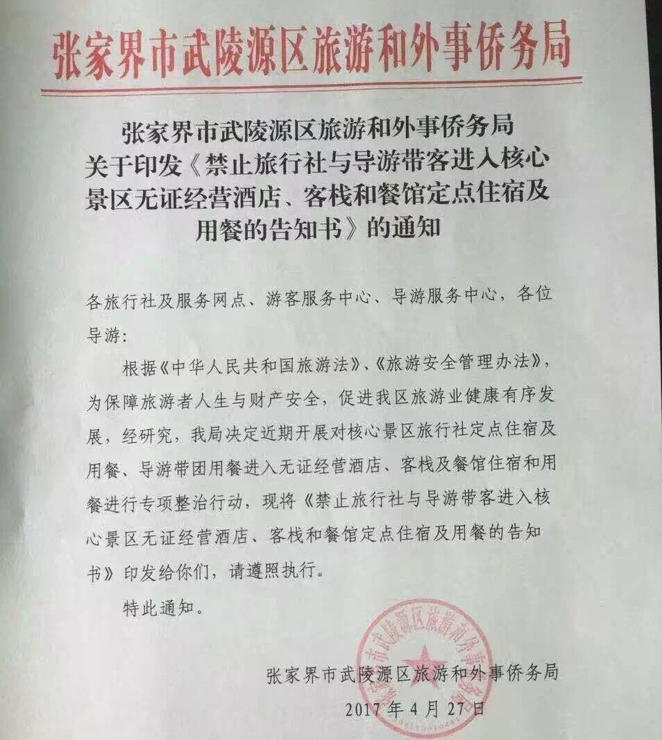 然而这一翻天覆地的变化到底是怎么一个情况呢?经过小编的四处打听,终于有了一些眉目。不是,也不是瘟疫,更不是鬼子要来了,原来这是张家界市武陵源区旅游和外事侨务局一个月前就发布了文件,《旅行社与导游带客进入核心景区无证经营酒店、客栈各餐馆定点住宿及用餐的告知书》的通知,由于涉及到部分原村民到前几天才彻底执行到位。核心景区的客栈是不可能办到营业执照的,其实以前核心景区山顶是有很多星级酒店的,99年我们的朱熔基总理来到张家界视察,就明确指出核心景区里的酒店一律要拆掉,影响生态,后来就全部把酒店拆掉了,当时只留下了很多原村民自已居住的房子,因为原住民要居住啊,有那么多户,一时也没办法安置,所以就留了下来,可是风声过后,一些商人出高价租了当地村民的房子然后改建成一些客栈从商,就这样整个景区就慢慢出现了大大小小的客栈了,一直到现在。