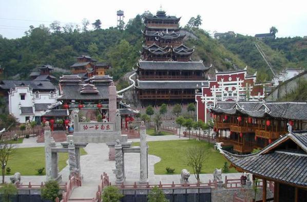 园内建筑多为木石结构,雕梁画栋,金壁辉煌,飞檐翘角,玲珑雅致。代表作有土司城堡、摆手堂、土家山寨、垕王宫等。特别是冲天楼,依山造阁,气势恢宏,楼高48米,九重十二层,曲径回复,独具匠心。民风民俗展示主要有土家婚俗、头饰服饰、蜡染、织锦、银匠、石匠以及奇石根雕,珍贵文物展等,还有整台原汁原味的土家文艺节目,如表现土家原始劳作与生活情形的茅古斯舞、铜铃舞、摆手舞、打溜子等表演。